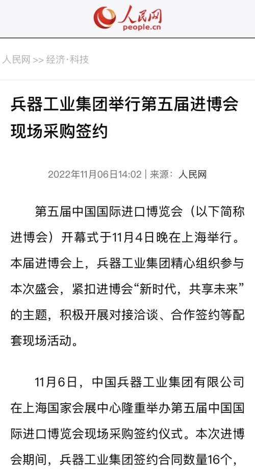 人民網:兵器工業集團舉行第五屆進博會現場采購簽約