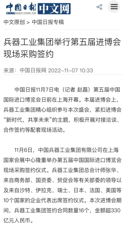 中國日報網:兵器工業集團舉行第五屆進博會現場采購簽約