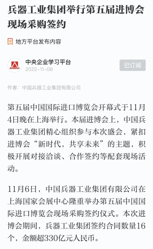 學習強國中央企業學習平臺:兵器工業集團舉行第五屆進博會現場采購簽約