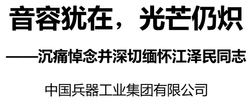 2022年11月30日12時13分,我黨我軍我國各族人民公認的享有崇高威望的卓越領導人,偉大的馬克思主義者,偉大的無產階級革命家、政治家、軍事家、外交家,久經考驗的共產主義戰士,中國特色社會主義偉大事業的杰出領導者,黨的第三代中央領導集體的核心,“三個代表”重要思想的主要創立者,我們敬愛的江澤民同志因病在上海逝世,享年96歲。我們懷著極其悲痛的心情,悼念這位卓越領導人,深切緬懷他對兵器工業的關懷與支持,以表達我們兵工人發自內心地對他的愛戴、敬仰和感恩之情。音容猶在,光芒仍熾。江澤民同志永遠活在我們心中!