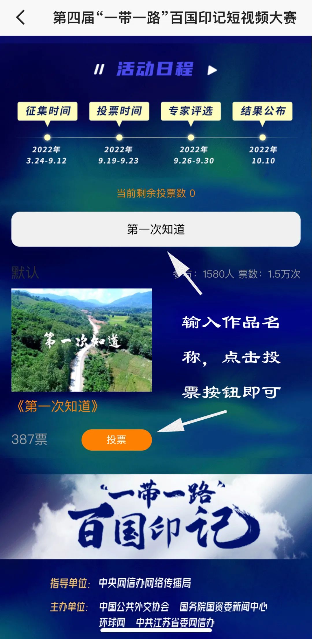 9月19日,由中央網信辦網絡傳播局指導,中國公共外交協會、國務院國資委新聞中心、環球網和中共江蘇省委網信辦聯合主辦的第四屆“一帶一路”百國印記短視頻大賽完成作品征集,正式開啟投票階段。