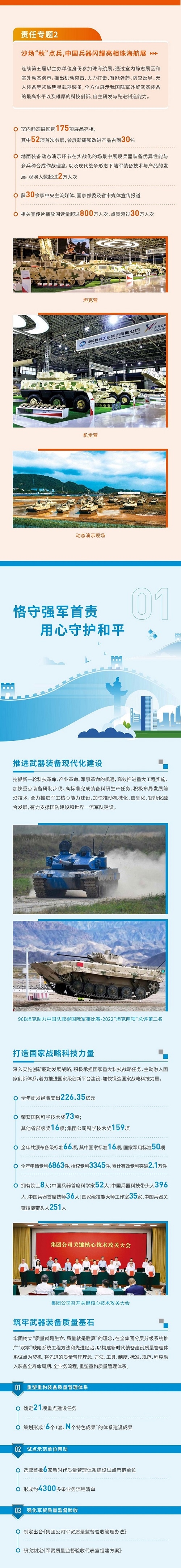 《報告》開篇設置“突出政治引領,全面加強黨的領導黨的建設”“沙場‘秋’點兵,中國兵器閃耀亮相珠海航展”兩個責任專題,聚焦集團公司加強黨建、強軍報國的擔當作為,書寫集團公司在新時代新征程上的奮進答卷。主體章節以“用心守護和平、用力爭創一流、用情溫暖社會”為主題,從恪守強軍首責、服務經濟建設、共創美好生活三個維度展現了集團公司立足“1+5”戰略和“雙十”規劃,聚焦新時代新征程新任務高質量履行政治責任、經濟責任和社會責任的具體行動和成效亮點,詮釋了集團公司服務國家戰略、服務國防和軍隊現代化建設、服務國家經濟社會發展的職責使命。