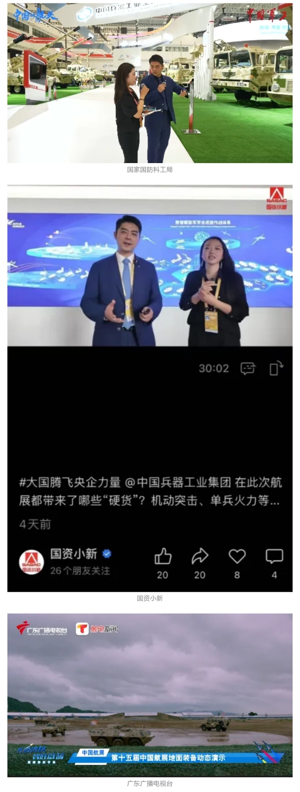 新華社、央視新聞、中央廣播電視總臺中國之聲、央視軍事、中國軍視網、廣東廣播電視臺等媒體以及國家國防科工局、國資小新等到兵器工業集團地面動態演示區、中國兵器館進行了直播。